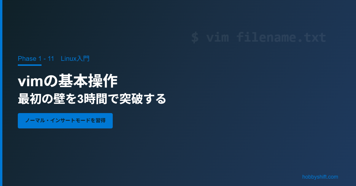 vim(Vi IMproved)はLinux/Unixに標準搭載されるテキストエディタです。サーバー作業では nano や VSCode が使えない環境でもvimは必ず使えます。最低限の操作を覚えておくと、SSH接続先でのファイル編集が格段に楽になります。