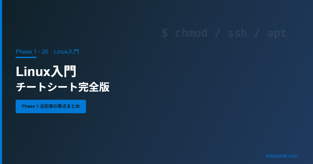 Phase 1「Linux入門」の全記事の要点をまとめたチートシートです。各記事へのリンクも掲載しています。