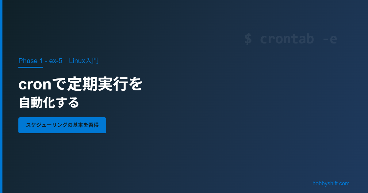 cron はLinuxに標準搭載されたジョブスケジューラです。指定した日時・間隔でコマンドやスクリプトを自動実行します。設定は crontab(cron table)ファイルに記述します。