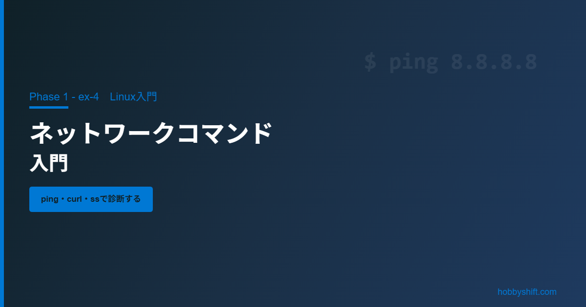 ping -c 4 ホスト:疎通確認(-cで回数指定必須)curl -I URL:HTTPヘッダー確認。-oでファイル保存wget URL:ファイルダウンロード。-cで再開可能ss -tuln:リスニングポートを確認(netstatの後継)ip addr:IPアドレス確認(ifconfigの後継)dig ドメイン:DNS解決の詳細確認