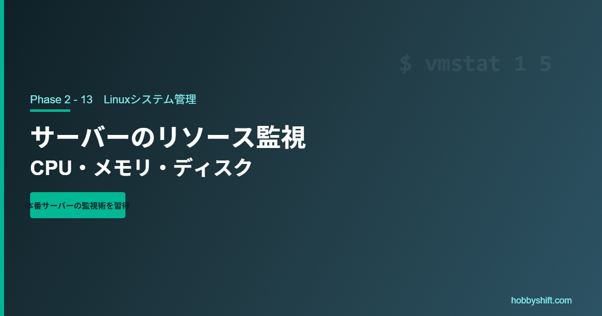 本番サーバーの安定運用には定期的なリソース監視が欠かせません。この記事ではCPU・メモリ・ディスク・ネットワークを監視するコマンドと、継続的な監視の仕組みを解説します。