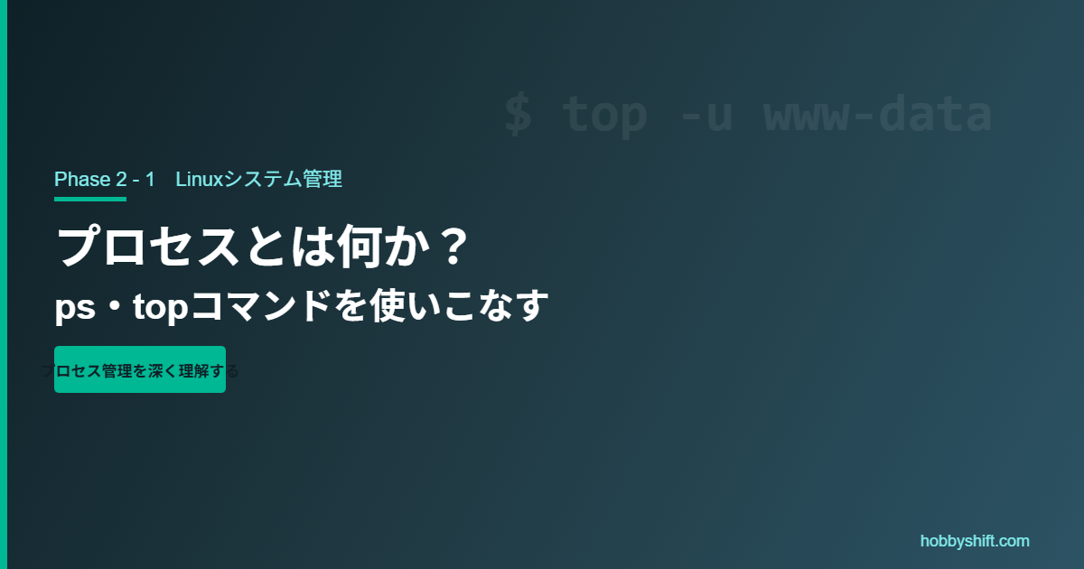 「サーバーが重い…何が原因?」「暴走しているプロセスを特定して止めたい」——そんな場面で使うのがプロセス管理コマンドです。Phase 1ではps/kill/systemctlの基本を学びました。この記事ではプロセスの概念から、tophtopの深い読み方、nice値による優先度制御まで踏み込みます。