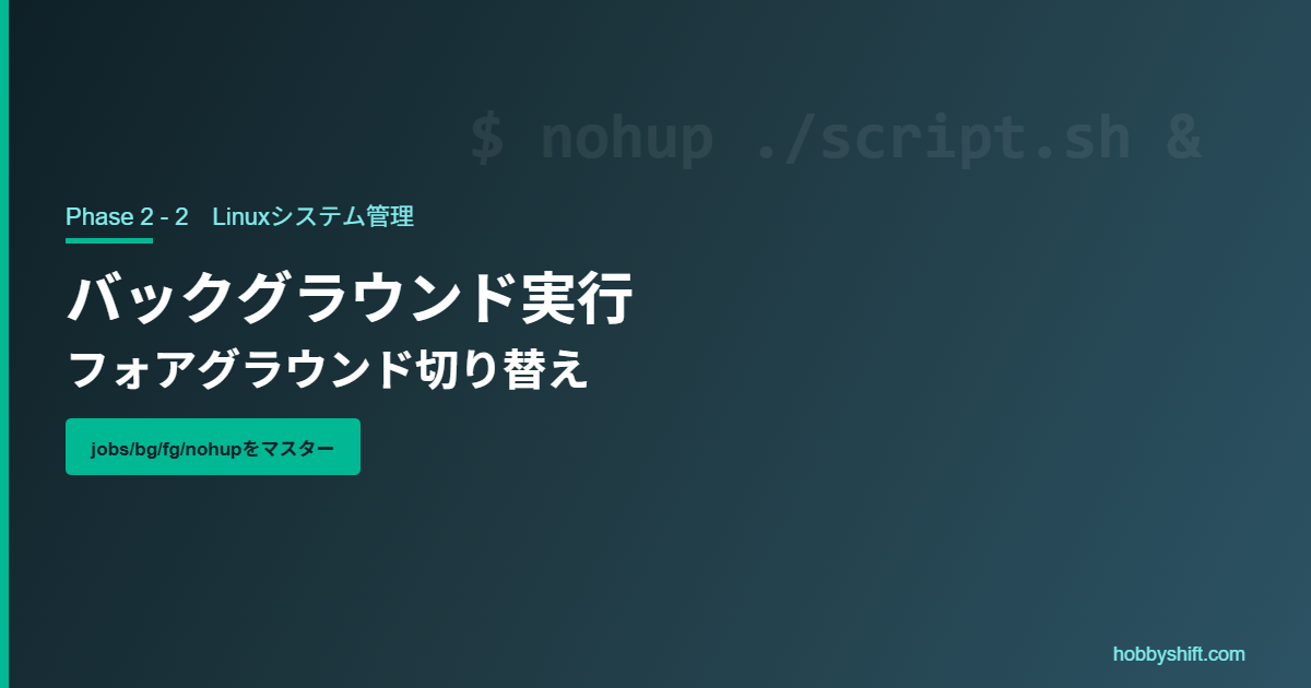&でバックグラウンド起動、Ctrl+Zでサスペンド、bg/fgで切り替えjobsでジョブ一覧確認。kill %番号で終了nohup コマンド &でSSH切断後も実行継続disownで実行中のジョブをシェルから切り離す- 本番環境の長時間処理には