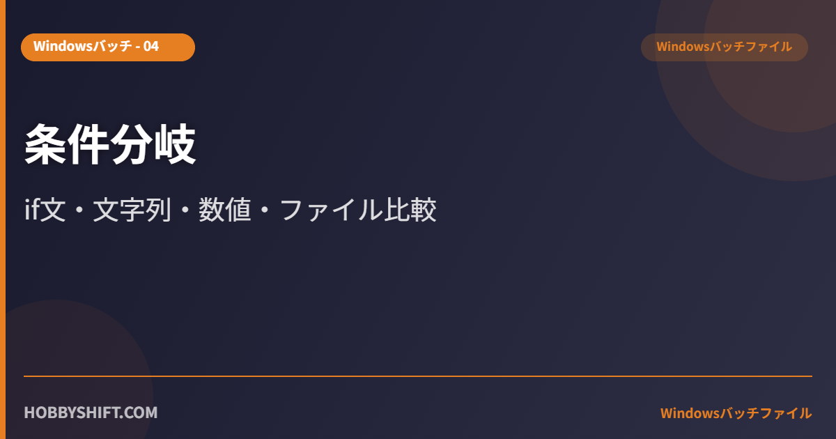バッチファイルで条件によって処理を変えるには if 文を使います。文字列・数値・ファイル存在・errorlevelの4つの比較パターンを解説します。