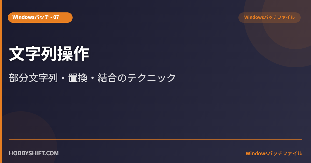 バッチファイルでの文字列操作を解説します。部分文字列の切り出し・置換・結合など実務で非常に使えるテクニックです。