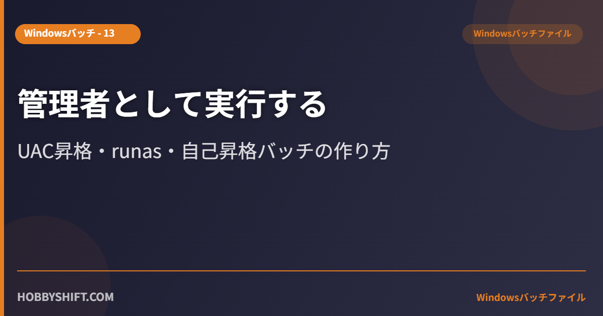バッチファイルで管理者権限が必要な処理を行う際の方法を解説します。UAC昇格・runas・自己昇格バッチの3つのアプローチを紹介します。