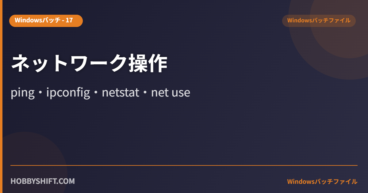バッチファイルからネットワーク操作を自動化できます。pingipconfignetstatnet useなどの使い方を解説します。