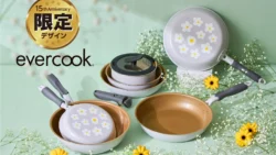 累計販売数800万枚突破の『evercook(エバークック)』から、ブランド創設15年を記念した限定デザインのフライパンが登場しました。ライトグレーの本体に白いお花が描かれた、新生活にもぴったりの可愛らしいデザインです。