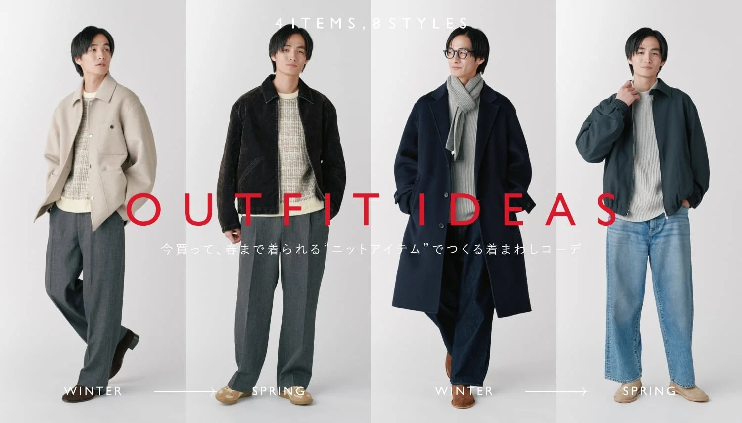 冬はウールリバーコートと合わせて、全体を淡いトーンでまとめた上品な着こなしが提案されています。重くなりがちな冬のコーデに、柔らかな色合いが抜け感を演出してくれるみたいです。シンプルだけど大人の余裕を感じさせるスタイルで、冬から春まで自然体で着こなせそうですね。