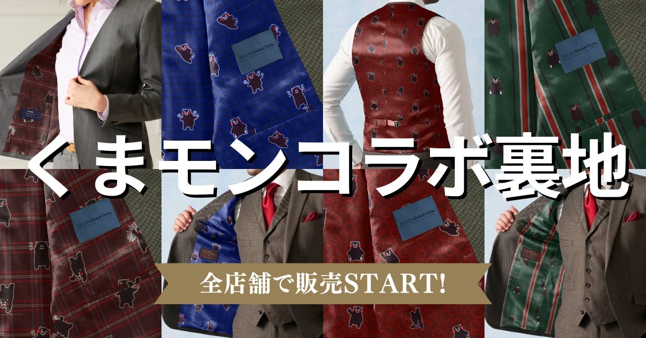 オーダースーツ専門店の「グローバルスタイル」さんで、なんと『くまモン』とのコラボレーション裏地が全国展開されたみたいですよ!以前は「GINZAグローバルスタイル・コンフォート COCOSA熊本店」さん限定だった人気デザインが、全国の全店舗とオンラインオーダーサービスで手に入るようになったんですって。