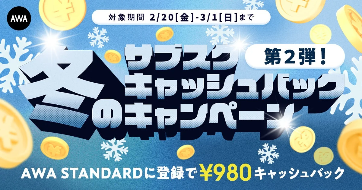 音楽ストリーミングサービス「AWA」が、STANDARD月額プランへのご登録者全員を対象に、なんと980円キャッシュバックするキャンペーンの第2弾を開催中です。