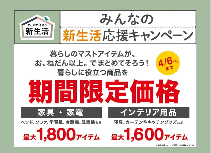 新生活を始める方も、お部屋をリフレッシュしたい方も、この機会にニトリのお得なキャンペーンを活用して、素敵な暮らしを始めてみませんか。